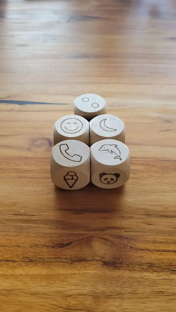 Wir bemühen uns, qualitativ gutes Holz zu beschaffen. Die Würfel werden von uns bearbeitet, geschliffen und poliert. Die Symbole lasern wir mithilfe eines Faserlasers blitzschnell. Danach kommt der Feinschliff - jeder Würfel wird zweimal gewachst und geölt.